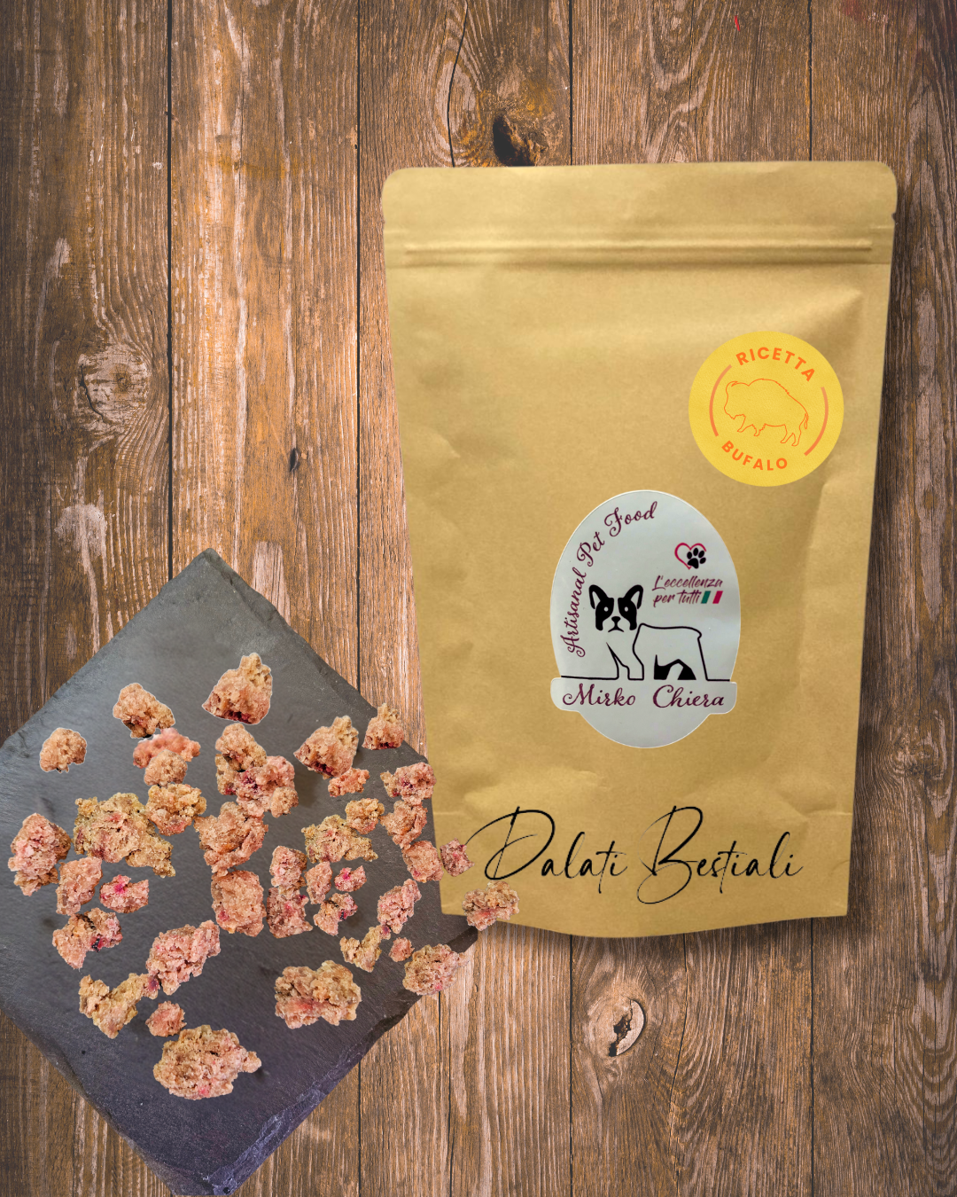 Composizione: Carne di Lombata di Bufalo 70% Lombata, Grano Saraceno, Zucca, Barbabietola, Banana, Mela, Estratto foglie di olivo, Olio di Borragine, Olio Girasole, Omega3, VIntegra, Guscio D'uovo Essiccato, Malva.