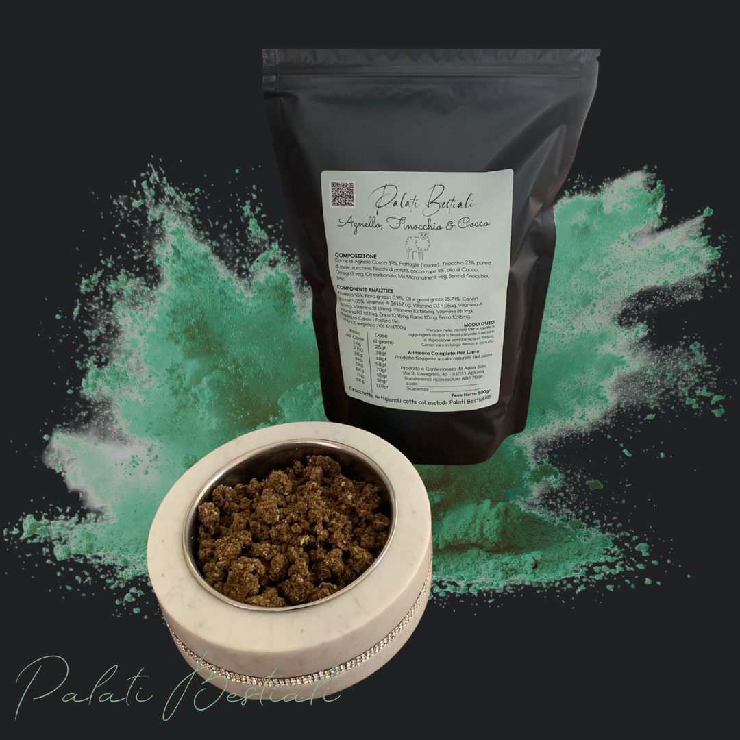 Composizione: Carne di Agnello (tipo coscia 70%), Finocchio, Purea di mele. Zucchine, Fiocchi di Patata, Cocco Rapè, Olio di Cocco, Omega3 Veg, Guscio D'Uovo, VIntegra, Semi di Finocchio, Timo