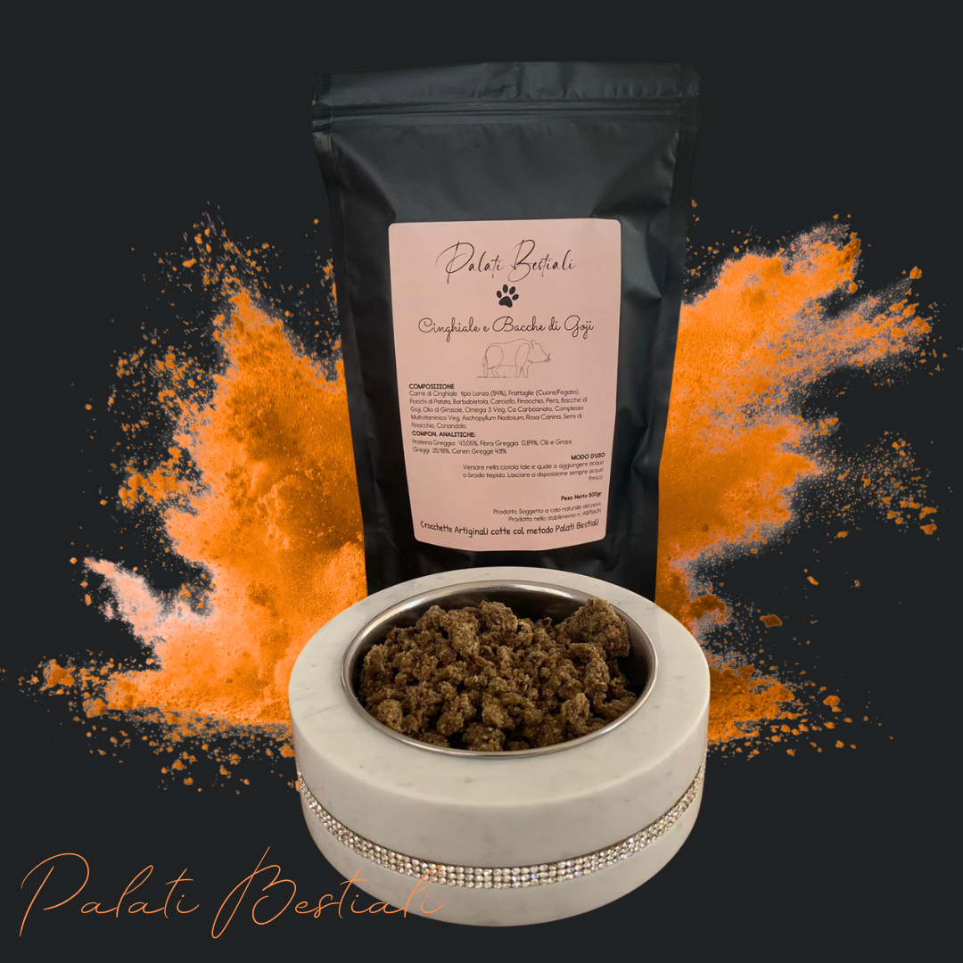 Composizione: carne di cinghiale ( taglio magro 63%), Fiocchi di patata, barbabietole, carciofo, finocchio, pera, bacche di goji, olio di girasole, omega3 , guscio d'uovo essiccato, VIntegra, Aschopyllum nodosum , rosa canina, semi di finocchio, coriandolo.
