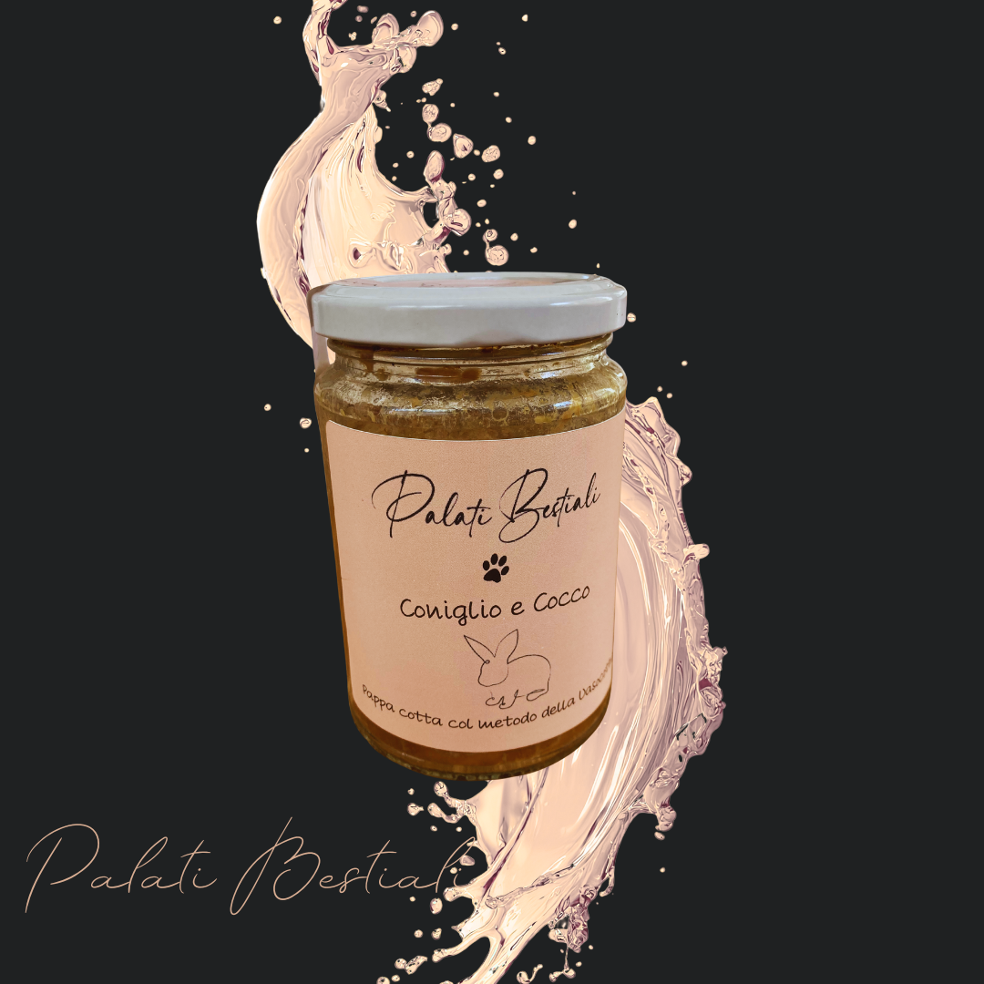 Composizione: Carne di Coniglio (tipo coscia 65%), Topinambur, Zucchine, Sedano, Banana, Cocco Rapè, Olio di Canapa, Omega 3Veg, Guscio d' Uovo Essiccato, V-Integra, Timo, Origano.