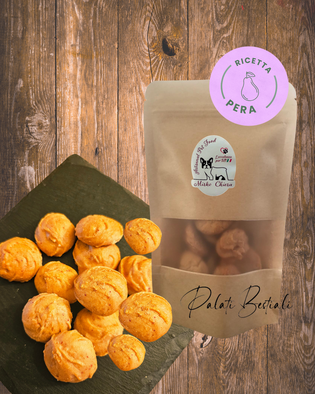 Ingredienti: Fecola di Patata, Purea di pera, Purea di sedano, Purea di Lamponi, Miele, uova e estratto di foglie di olivo.