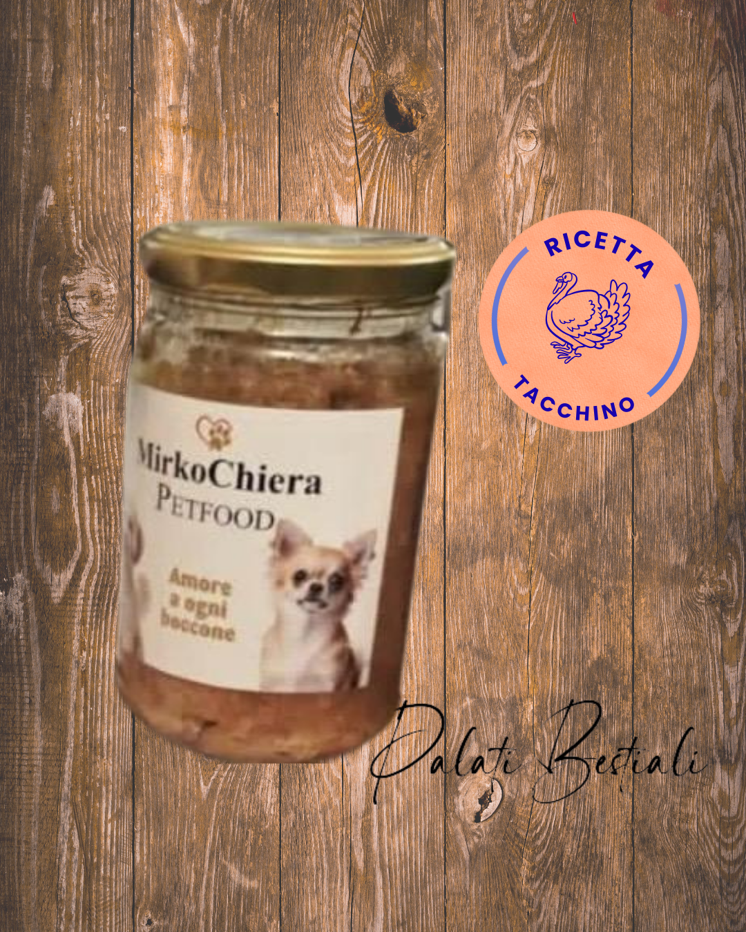 Composizione: Petto di Tacchino 65% , Patata Dolce, Carota, Sedano, Mela, Mirtilli, Olio Girasole, Guscio d' Uovo Essiccato, Omega3, VIntegra, Zeolite attivata, Rosa Canina, Coriandolo.